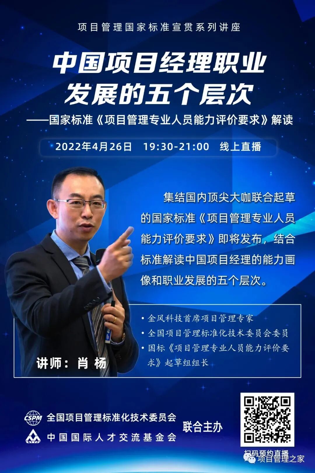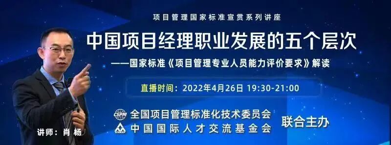 由全国项目管理标准化技术委员会和中国国际人才交流基金会共同主办的2022年第一期项目管理国家标准线上宣贯讲座:中国项目经理职业发展的五个层次——《项目管理专业人员能力评价要求》国家标准解读将于2022年4月26日开播。
