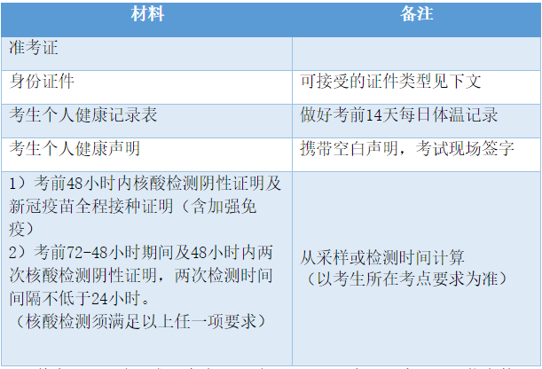 为保障广大考生和考点工作人员的健康,本次考试新增防疫要求。因此,本次考试,考生需携带的材料较多,具体清单如下: